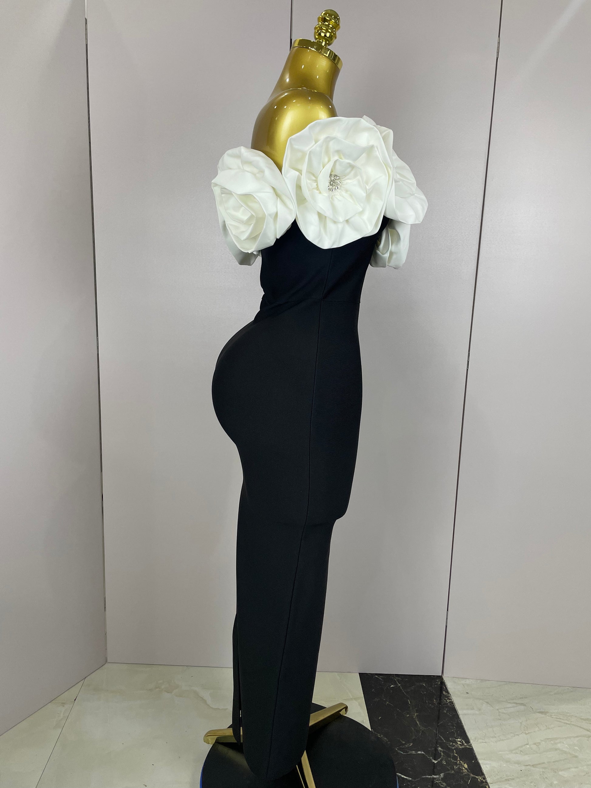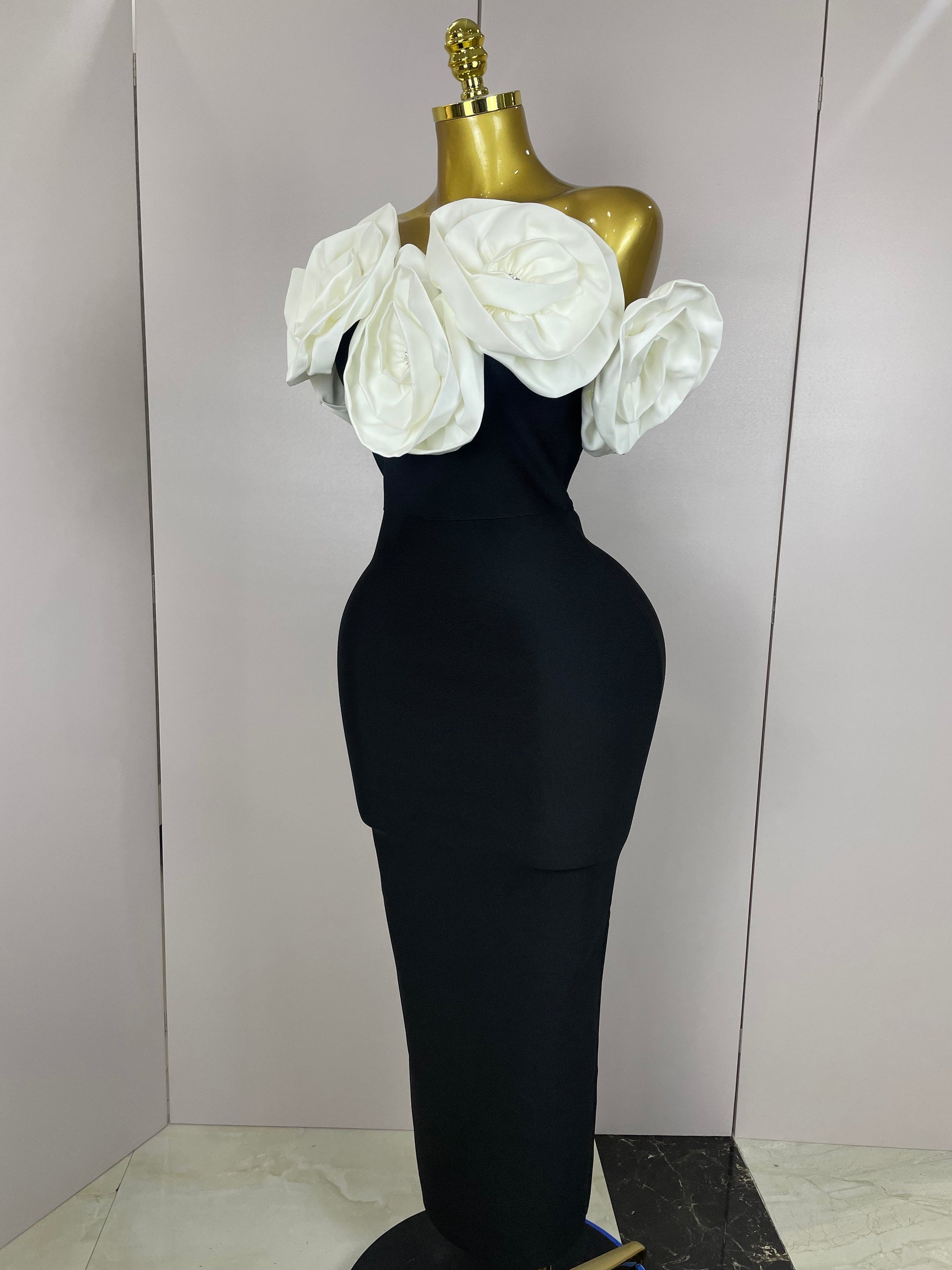 Élégante et sculpturale, cette robe longue noire met en valeur la silhouette avec une coupe ajustée et un décolleté bardot orné de fleurs dorées texturées. Chaque détail est pensé pour sublimer votre allure lors d’occasions spéciales : mariages, soirées de gala ou évènements professionnels haut de gamme.