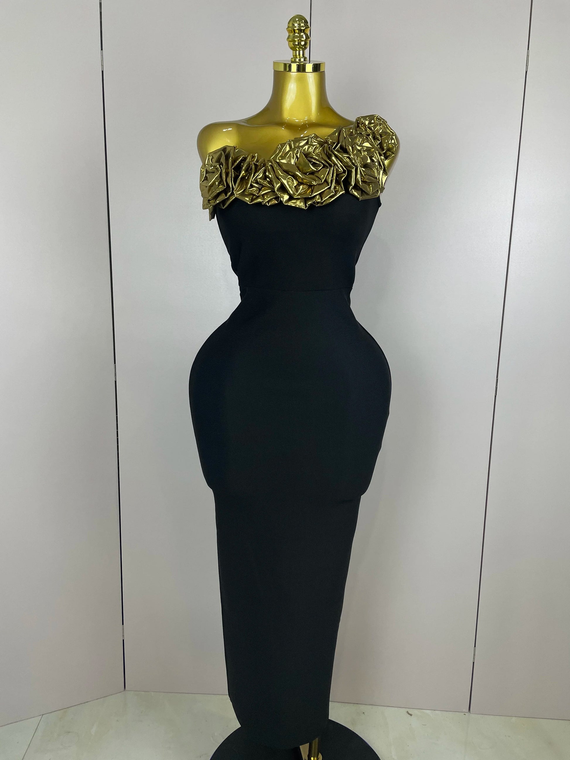 Élégante et sculpturale, la robe Malsa Golden Bloom incarne le raffinement à l’état pur.