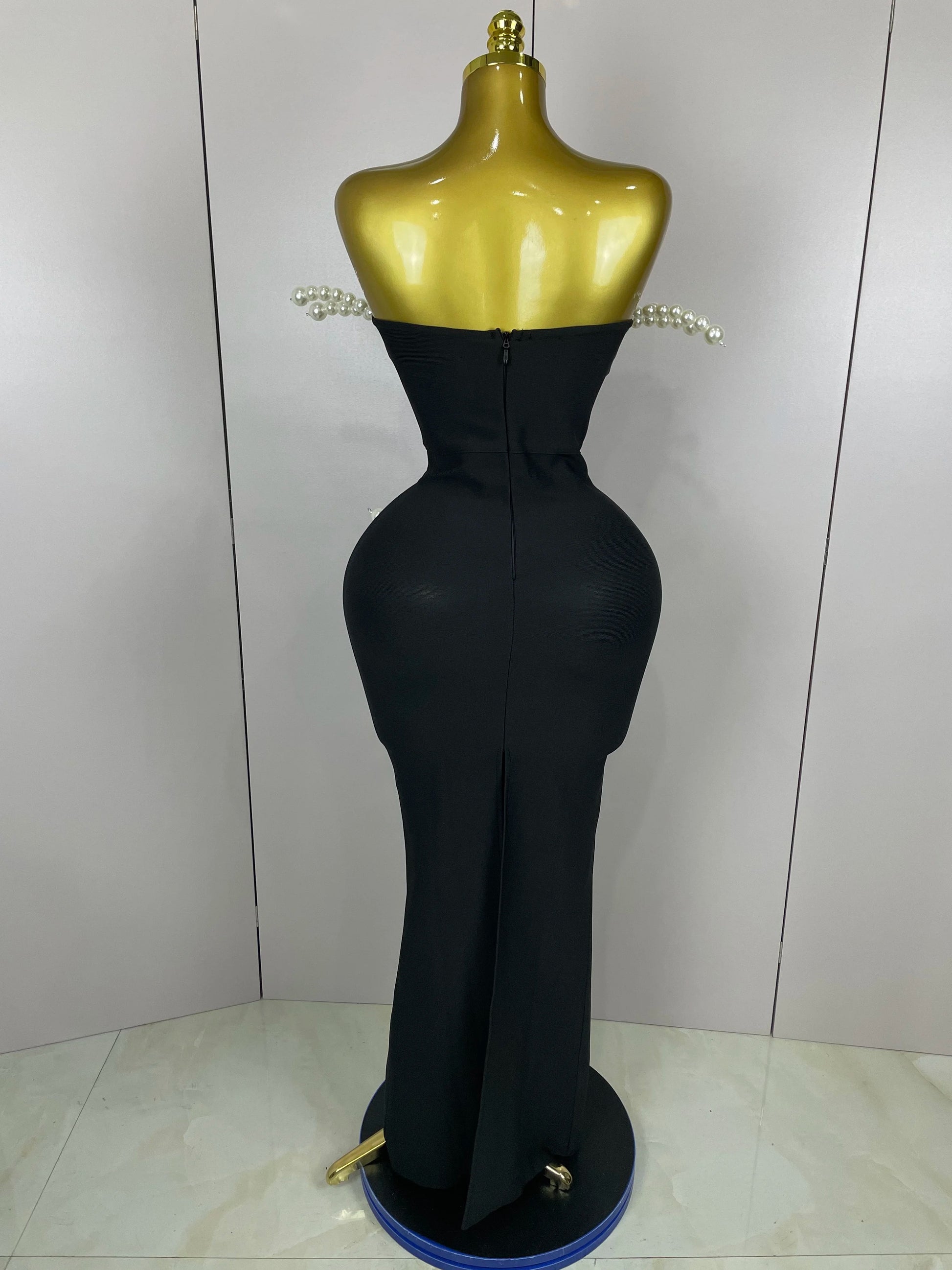 Cette robe noire moulante est une œuvre d'art à elle seule, magnifiée par des rangées de perles nacrées oversize qui encadrent la silhouette comme des ailes de perles flottantes.