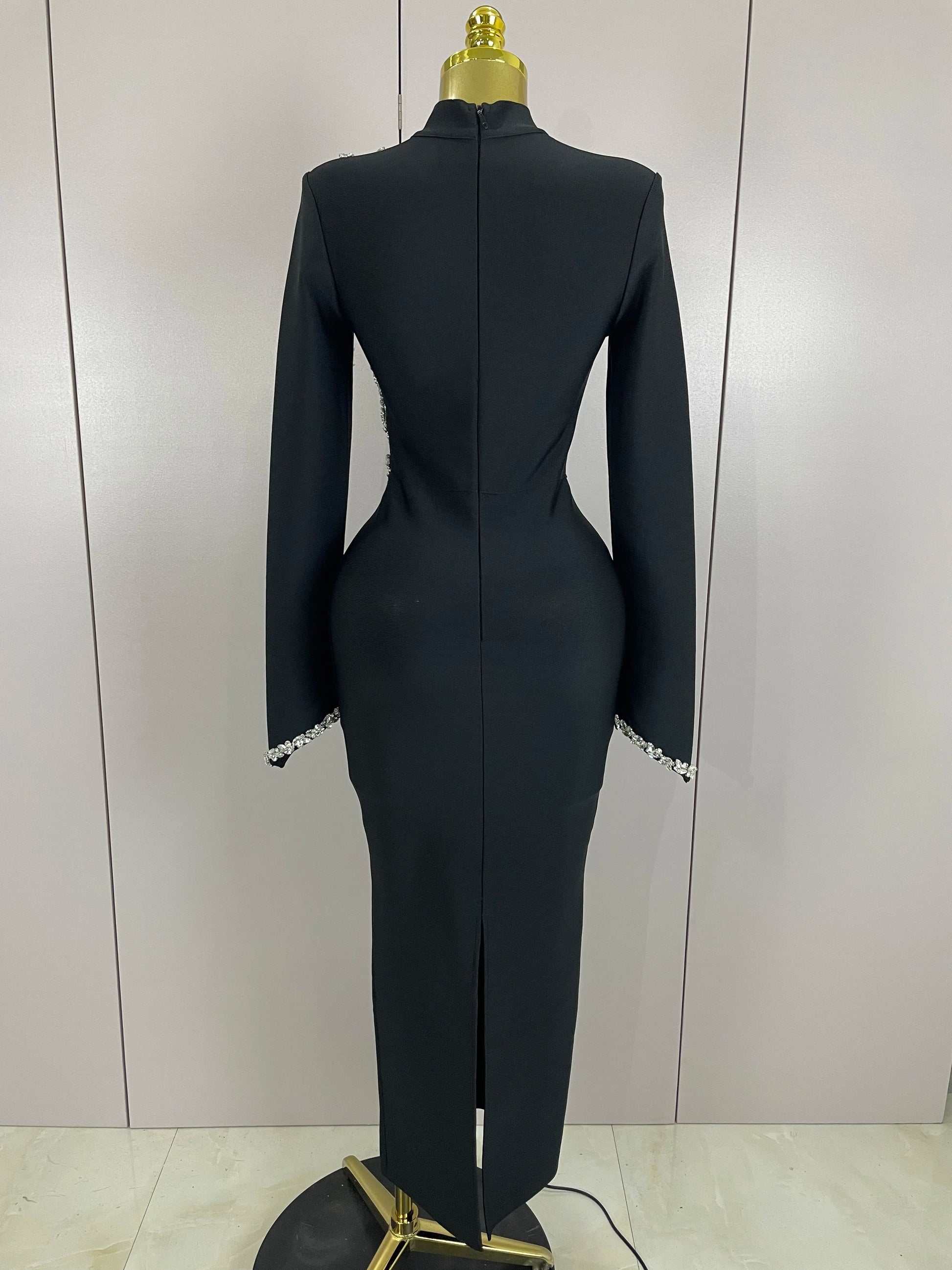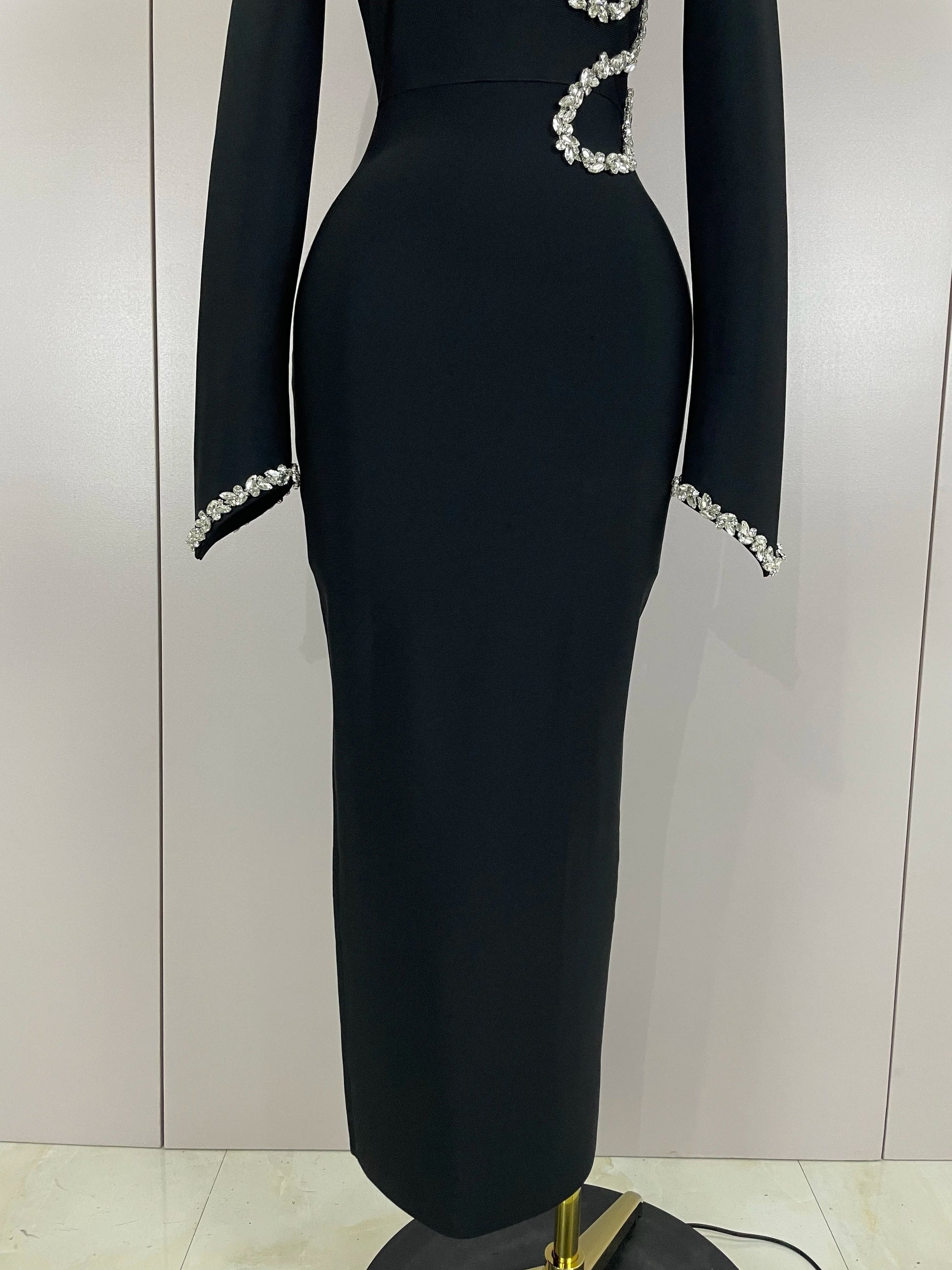 Les manches longues droites et la finition ornée de cristaux au niveau du poignet et du buste créent une allure à la fois moderne et raffinée.