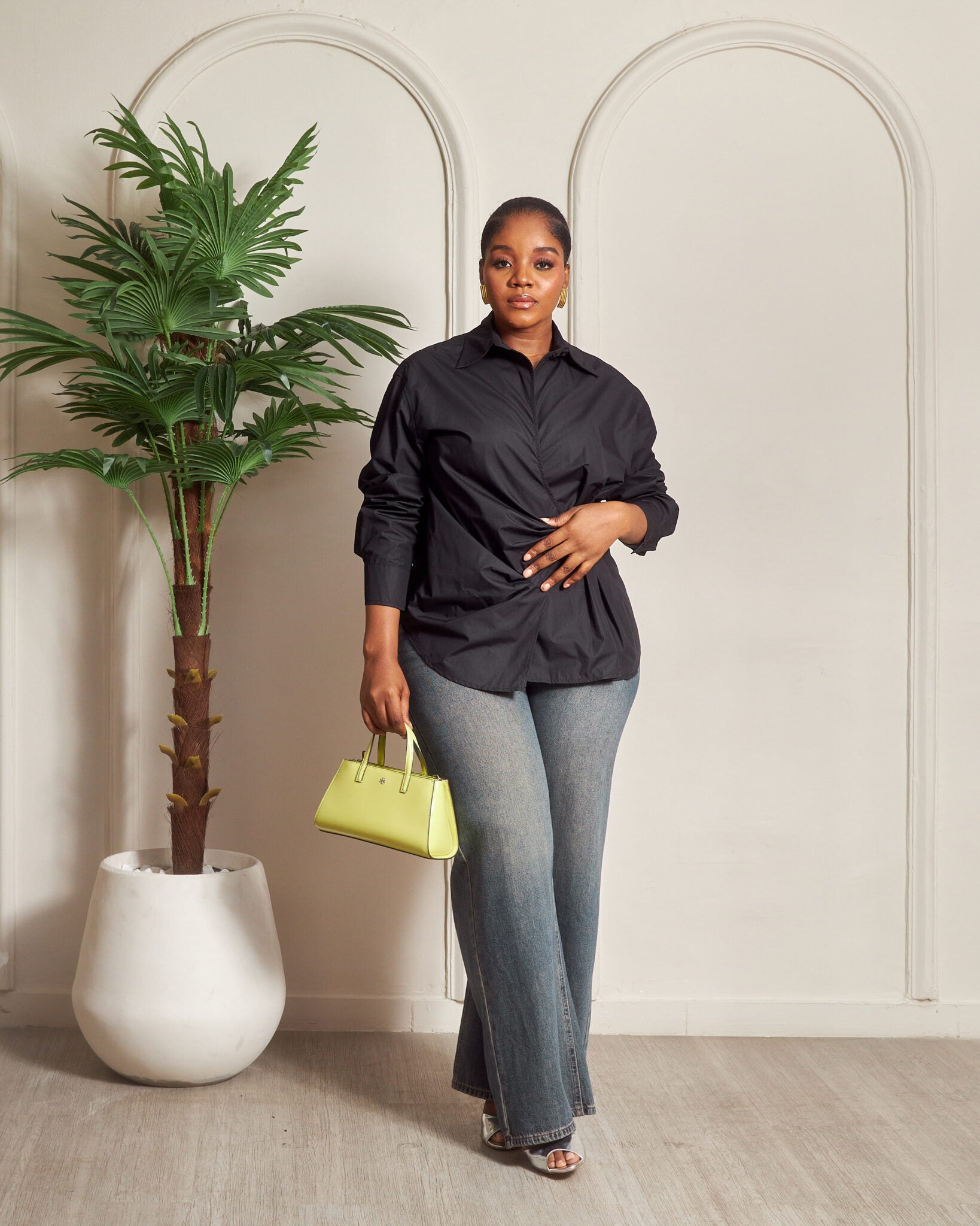 Disponible en noir intemporel et en blanc éclatant, elle se distingue par son détail noué sur le devant qui met en valeur la silhouette tout en apportant une touche sophistiquée.